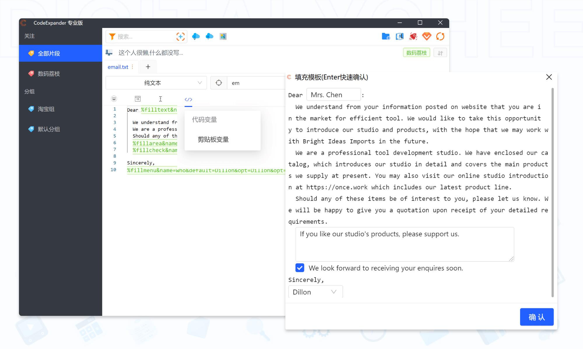 CodeExpander 是一款快捷短语输入增强工具,通过键入缩写可自动替换为自定义文段,减少重复性输入提升工作效率。支持分组高效管理代码片段,可跨平台数据云同步。
